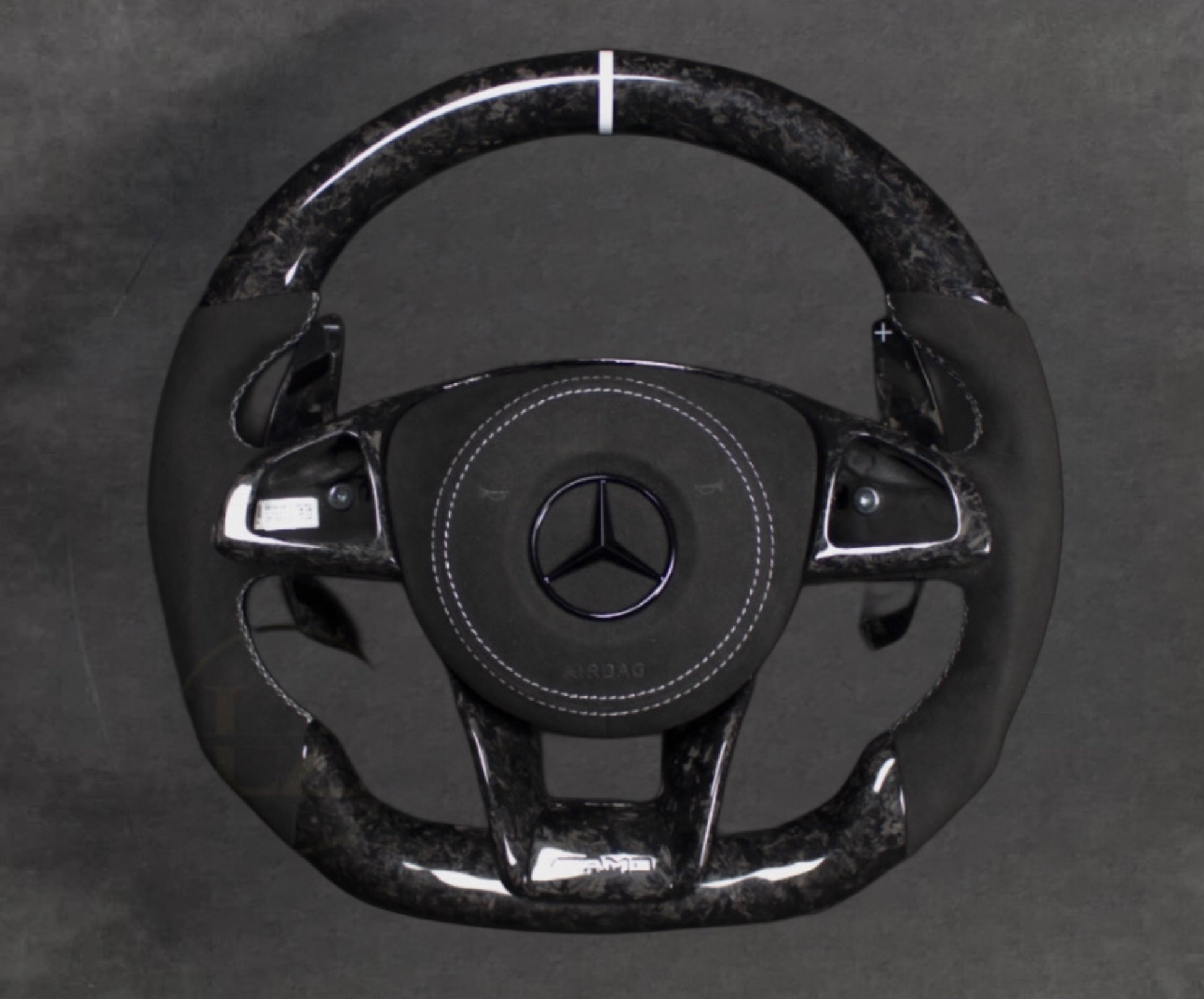This AMG Performance steering wheel combines genuine Forged Carbon Fiber with Alcantara Handlings.. Designed to OEM specifications for Mercedes-Benz, it enhances both the interior styling and the driving experience by providing real-time performance data directly on the wheel.