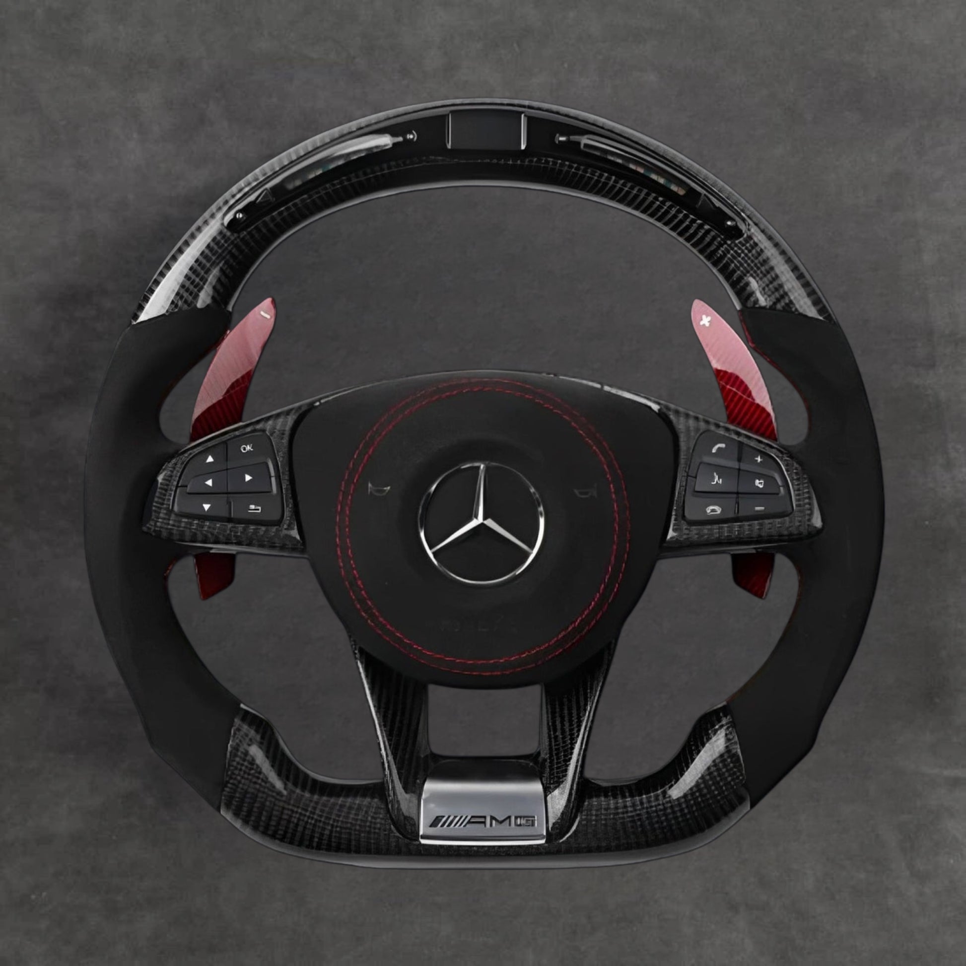 This AMG Steering wheel combines genuine carbon fiber integrates a digital LED performance display. Designed to OEM specifications for Mercedes-Benz, it enhances both the interior styling and the driving experience by providing real-time performance data directly on the wheel.