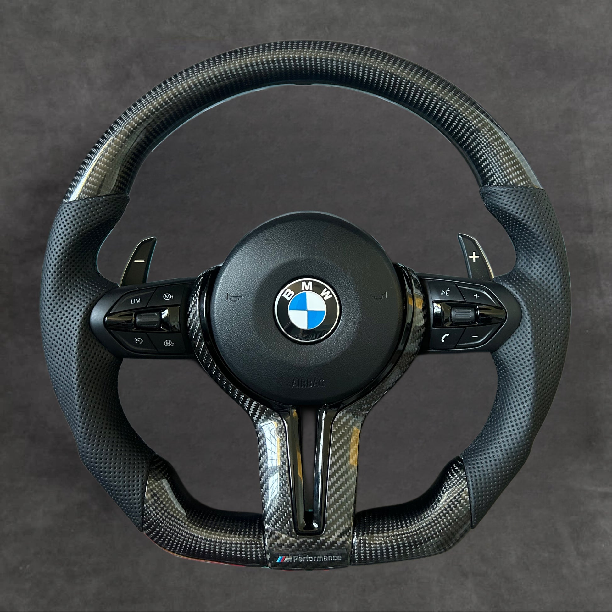 This Carbon Fiber Steering Wheel is designed to transform the driving experience of BMW F-Series models. Built on a genuine core, it combines motorsport functionality with factory-level fitment and refined craftsmanship. The gloss carbon fiber, reshaped grips, and fully integrated shape create a perfect balance of style, feedback, and control.